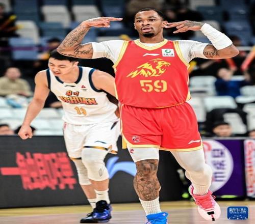 1月15日,浙江方兴渡队球员塔克(右)在比赛中投入三分球后庆祝。新华社记者 江汉 摄