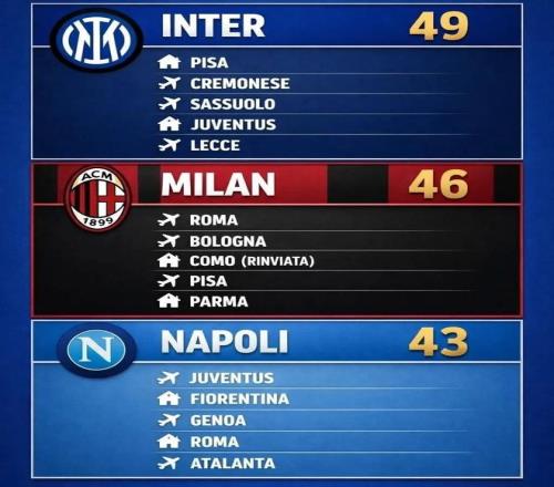 AC米兰则连续对阵罗马、博洛尼亚和科莫三支争夺欧战资格的球队,另外比萨和帕尔马这样的弱旅对于红黑军团也可能是“温柔陷阱”,上半程球队多次劫富济贫,在弱队身上丢分。而那不勒斯本轮客场挑战尤文,之后客战罗马与主场对阵亚特兰大的三场比赛并不好踢,另外佛罗伦萨和热那亚的实力也不容小觑,同样会给缺兵少将的那不勒斯带来一定麻烦。